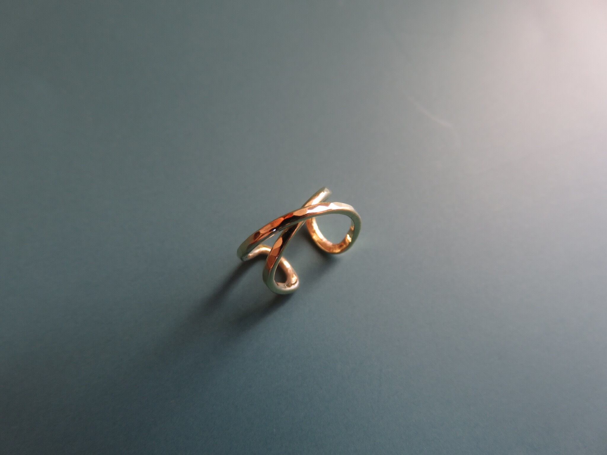 真鍮線を加工したシンプルなイヤーカフです。クロスさせ表面は槌目を付けました。細い丸線で製作してるのでサイズは調整しやすく、耳あたりも優しいです。