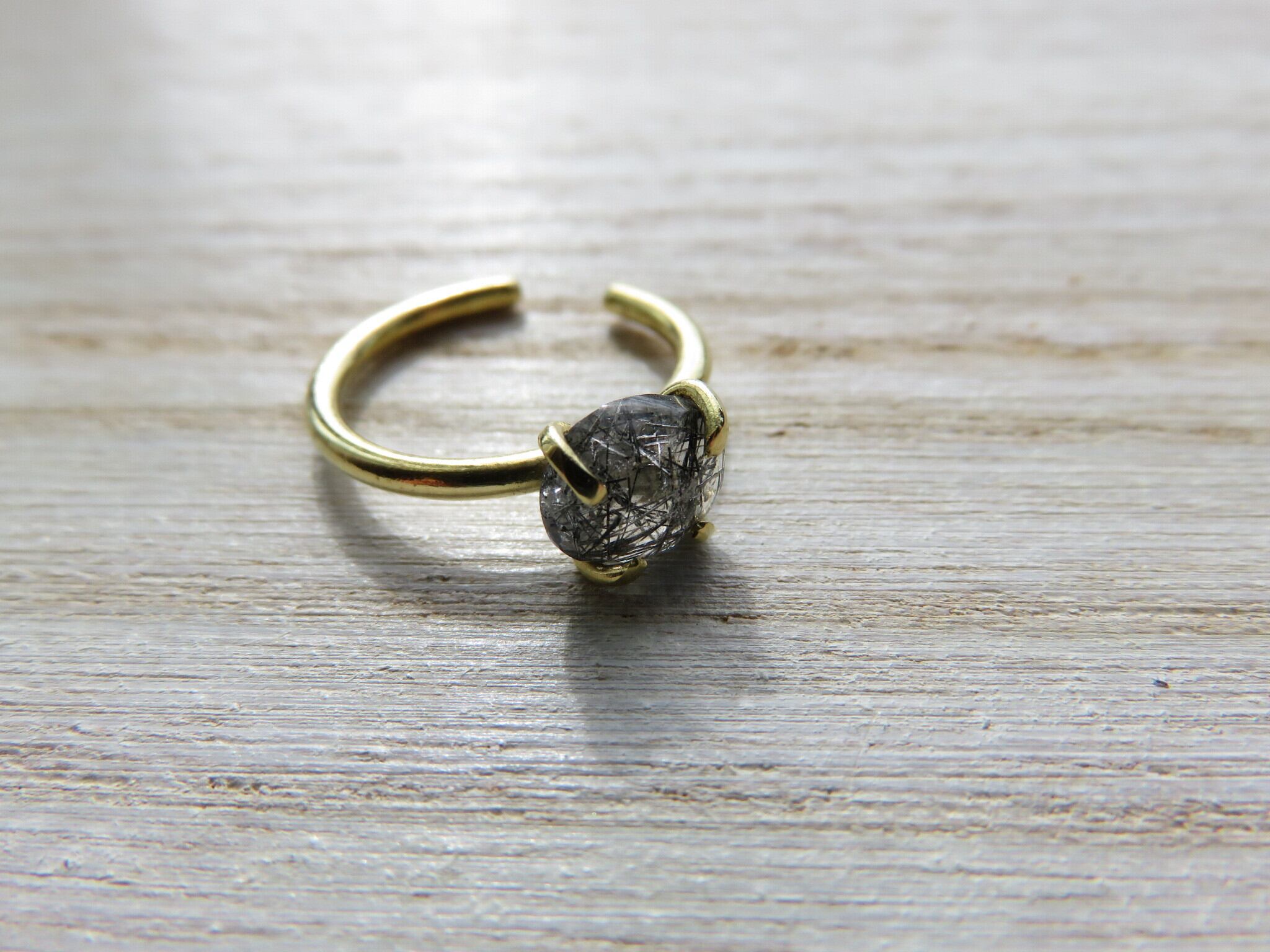 宝石質トルマリンクォーツAAAを爪留めした真鍮のイヤーカフです。石の高さが低めなので天然石イヤーカフ初心者の方もつけやすいデザインです。