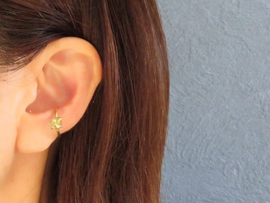 宝石質ペリドットのローズカットを爪留めした真鍮のイヤーカフです。石の高さが低めなので天然石イヤーカフ初心者の方もつけやすいデザインです。