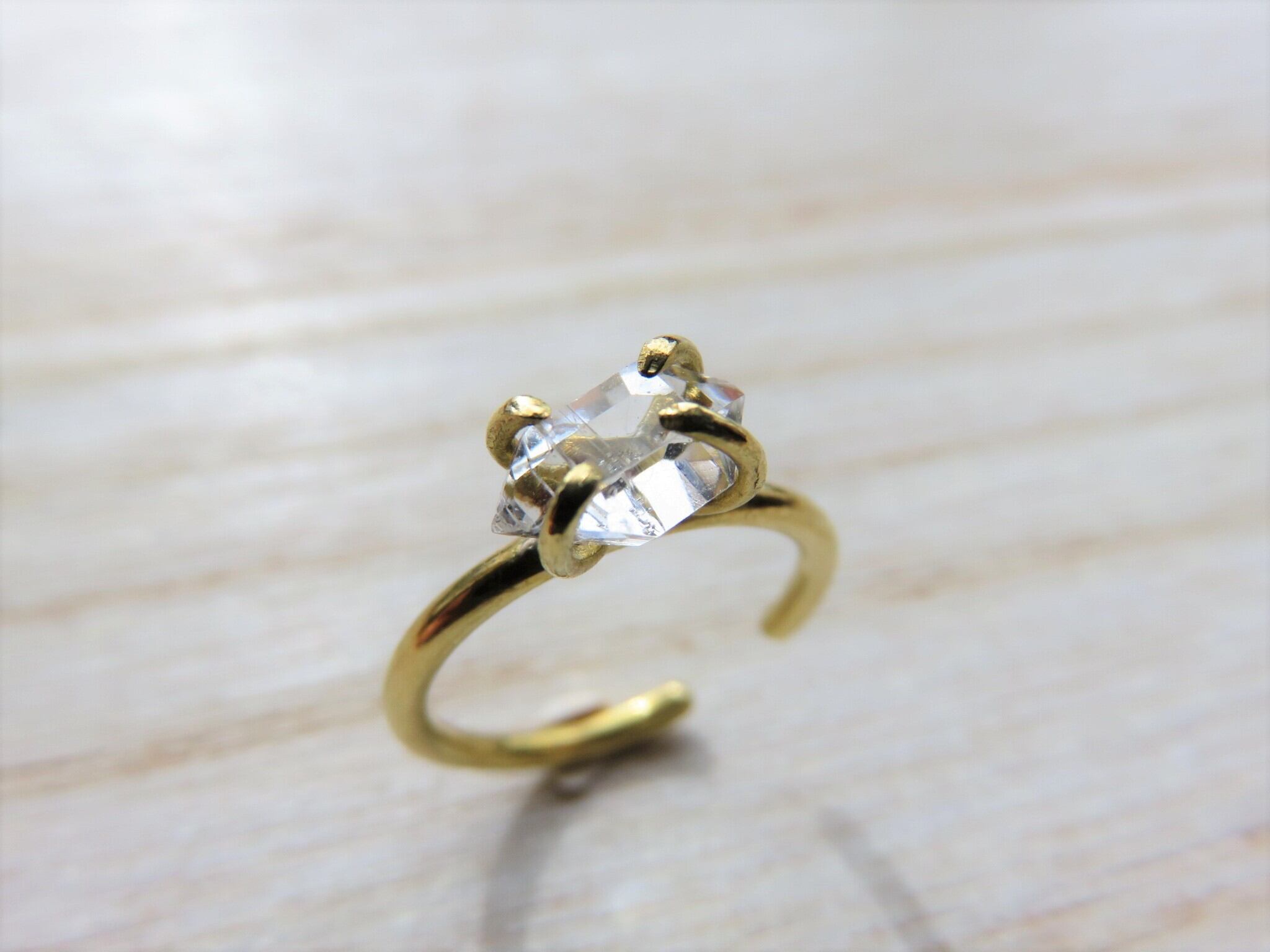 ハーキマーダイヤモンドクォーツの結晶を爪留めした真鍮のイヤーカフです。ハーキマーダイヤモンドクォーツの結晶の美しさを楽しめる存在感抜群のイヤーカフです。
