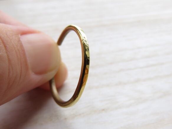 表面は槌目加工で仕上げました。2.0mmの真鍮線を一本ずつ火であぶり柔らかくしてから、金槌で叩いて製作しています。サイズは調整しやすく耳あたりも優しいです。