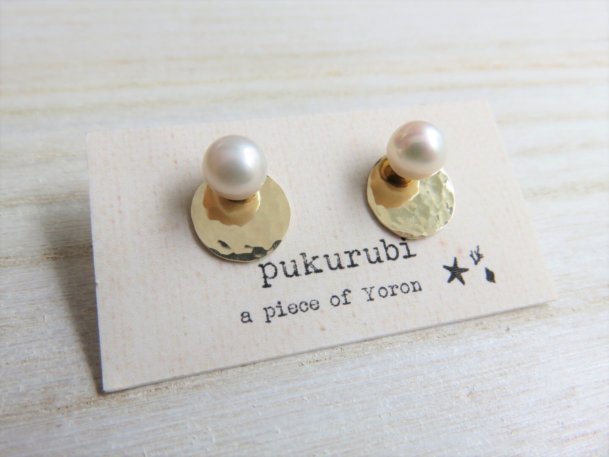 真鍮の板から丸モチーフを糸ノコで切り出し、表面を金槌で叩いて槌目を付けたパーツが取り外しできる14kgfの淡水パールピアスです。