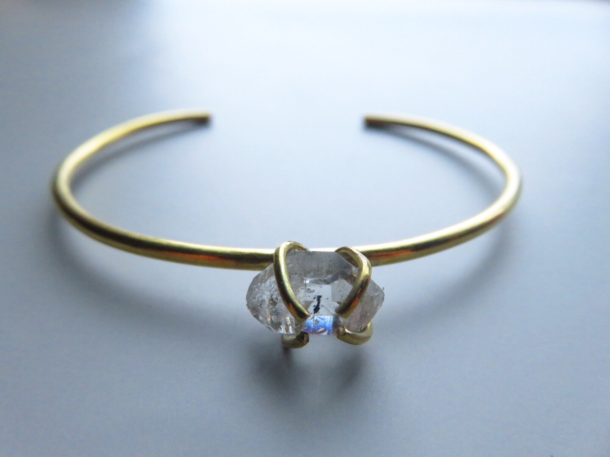 太さ2mmの真鍮バングルに大き目のハーキマーダイヤモンドを立爪で留めました。シンプルながらもインプラントのあるバングルです。