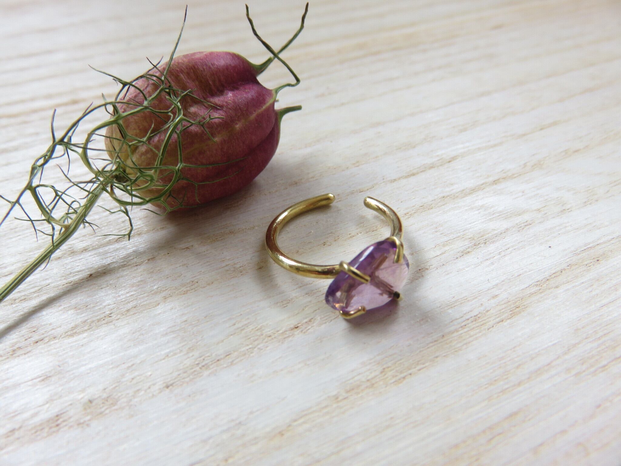宝石質アメジストのローズカットを爪留めした真鍮のイヤーカフです。石の高さが低めなので天然石イヤーカフ初心者の方もつけやすいデザインです。